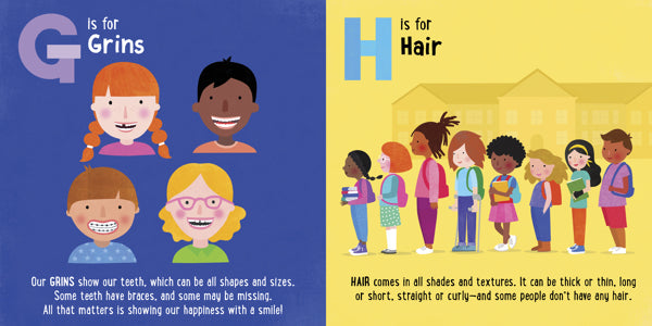 ABC Let’s Celebrate You & Me presents a whole alphabet full of positive attributes kids can celebrate, including their bodies, skin, eyes, and hair, on the outside, as well as inner qualities, such as their interests, kindness, and personalities.