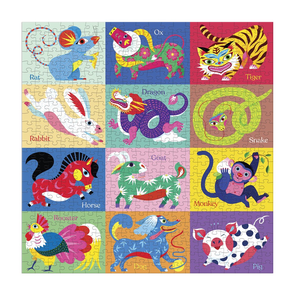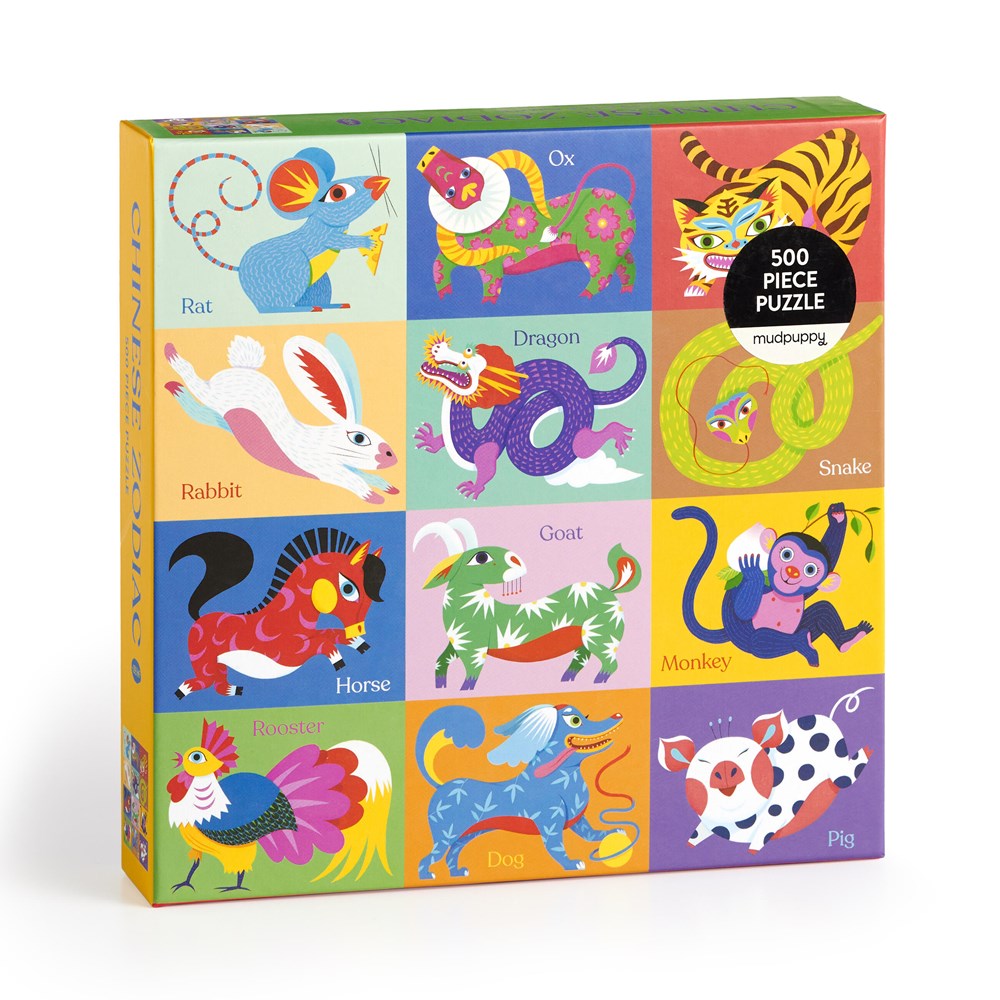 500 PIECE PUZZLE – Chinese Zodiac 500 Piece Puzzle by Mudpuppy colorful illustrations of the 12 animals represented in the Chinese Zodiac. This puzzle is just the right level of challenge for the whole family to join in on for hours of puzzling fun! The box includes an insert with the full puzzle image for reference.