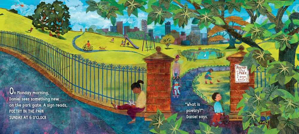 “Fetching testament to the maxim that ‘poetry is all around us.’ . . . Glorious flora and handsomely textured rocks are abundant. . . . The lush oil illustrations, which consist of collages made from tissue paper and patterned with handmade stamps, create a world saturated in color and texture, complementing the animals’ well-chosen words about beauty and poetry in the natural world. Readers will take many repeat visits to Daniel’s inviting park.”—Booklist