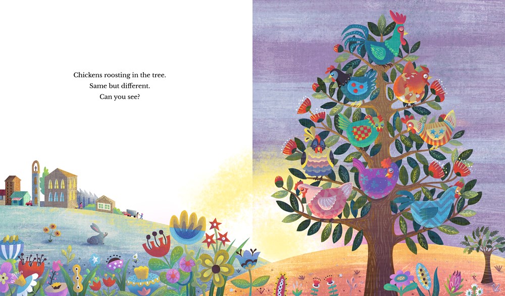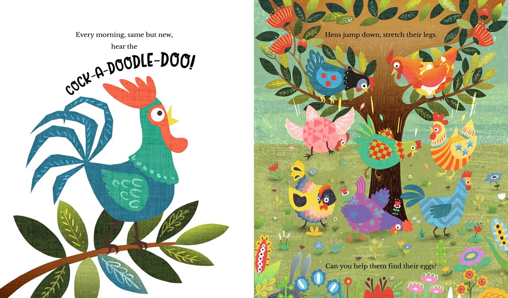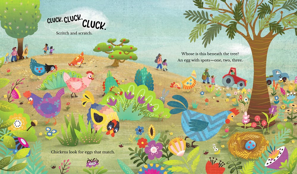 Amid a kaleidoscope of colors, chickens with spots, stripes, and zigzags are scritching and scratching and looking for their eggs. There are eggs in a haystack, under a tree, inside a barn, and even tucked in a shoe. Who can help the hens find the eggs that match them before they hatch into chicks? From award-winning New Zealand author-illustrator Ruth Paul comes an energetic concept book that doubles as a celebration of same-but-different creatures everywhere.