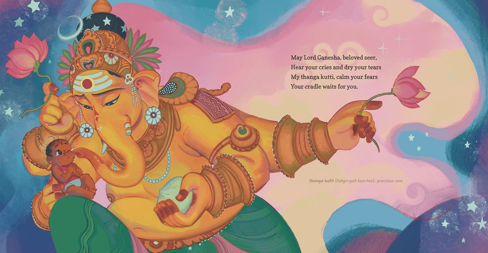 [A] culturally rich bedtime picture book. . . Lushly rendered, dreamlike illustrations from Ali, in blues, golds, greens, and pinks, seem to evoke the iconography of South Indian Hindu temples, while spot illustrations throughout highlight lore and traditions. Lilting rhymes from Rajan Gopal (The Desert Queen) drive this tender familial lullaby with devotional cadences.