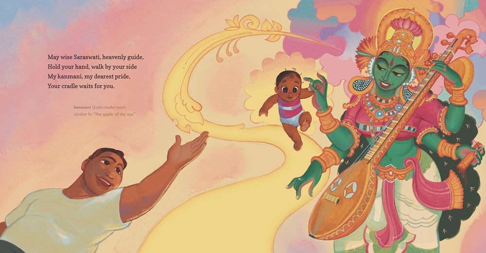 This calming story weaves a gentle circle of love. Tamil endearments intertwine with the elders’ hopes, blessings, and prayers for the newest member of the family. Bold images in rich blues, sunset yellows, and dusky oranges showcase the Hindu gods in their regalia. . . . A lullaby that radiates feelings of protection and hope.