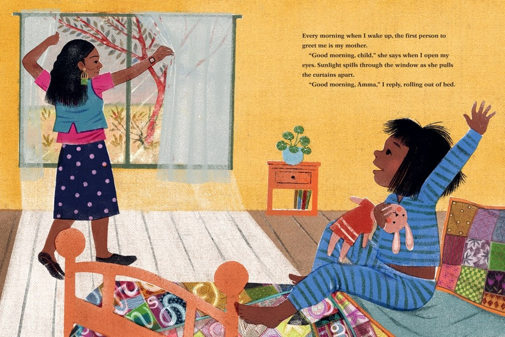 “Thank you, Amma,” says the child as her mother praises a birdhouse she’s making with her friend Angelina. With two languages spoken at home, English and Malayalam (the most common language in Kerala, India, where her parents and grandparents were born), Amma is a word the child uses for her Indian-American mom. But Angelina, whose family is from Mexico City, says that her mother is called Mamá. And there are so many other names for mother! Thea’s mother is Greek and known as Mana. Francisco’s family is from Brazil, where moms answer to Mãe. Aliya is fluent in Arabic, whose word for mother is Umma. . . . With just a peek at the many ways to say mother among the world’s thousands of languages, the author and illustrator behind My Mother’s Tongues have fashioned another love letter to family bonds and heritage, another salute to multilingualism for a world that grows smaller and more connected day by day.