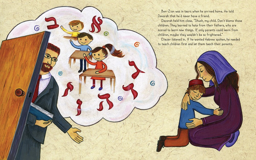 Influenced by illuminated manuscripts, Karla Gudeon’s illustrations bring Ben Zion—and the rebirth of Hebrew—to life.