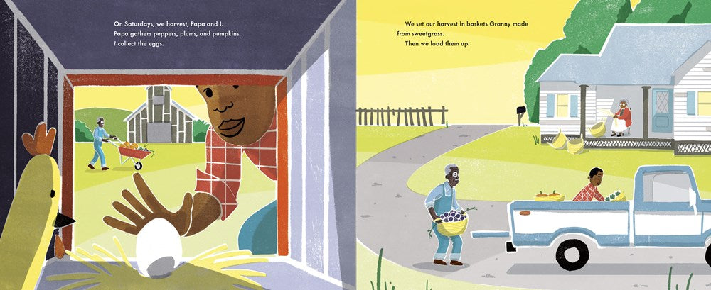 Saturday is for harvesting. And one little boy is excited to work alongside his Papa as they collect eggs, plums, peppers and pumpkins to sell at their stand in the farmer's market. Of course, it's more than a farmer's market. Papa knows each customer's order, from Ms. Rosa's pumpkins to Mr. Johnny's peppers. And when Papa can't make it to the stand, his community gathers around him, with dishes made of his own produce.