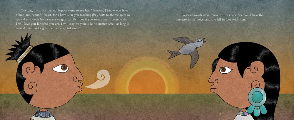 Izta was the most beautiful princess in the land, and suitors traveled from far and wide to woo her. Even though she was the daughter of the emperor, Izta had no desire to marry a man of wealth and power. Instead, she fell in love with Popoca, a brave warrior who fought in her father’s army—and a man who did not offer her riches but a promise to stay by her side forever.
