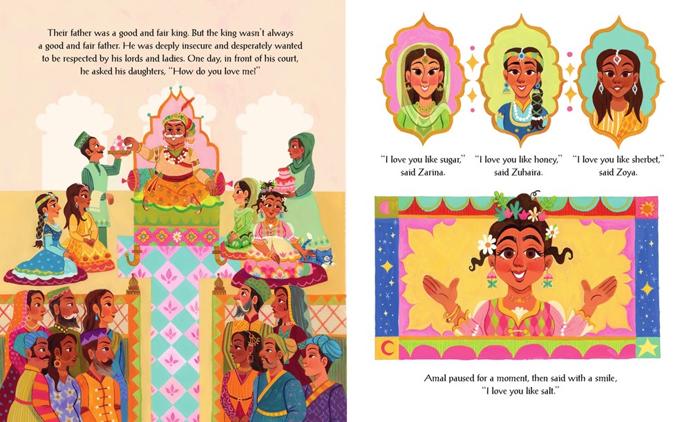 This was tolerated until one day...their father asked each daughter how much they loved him. Each princess responded sweetly with: "I love you like sugar." "I love you like honey." "I love you like sherbet." Finally, it was Amal's turn. "I love you like salt."