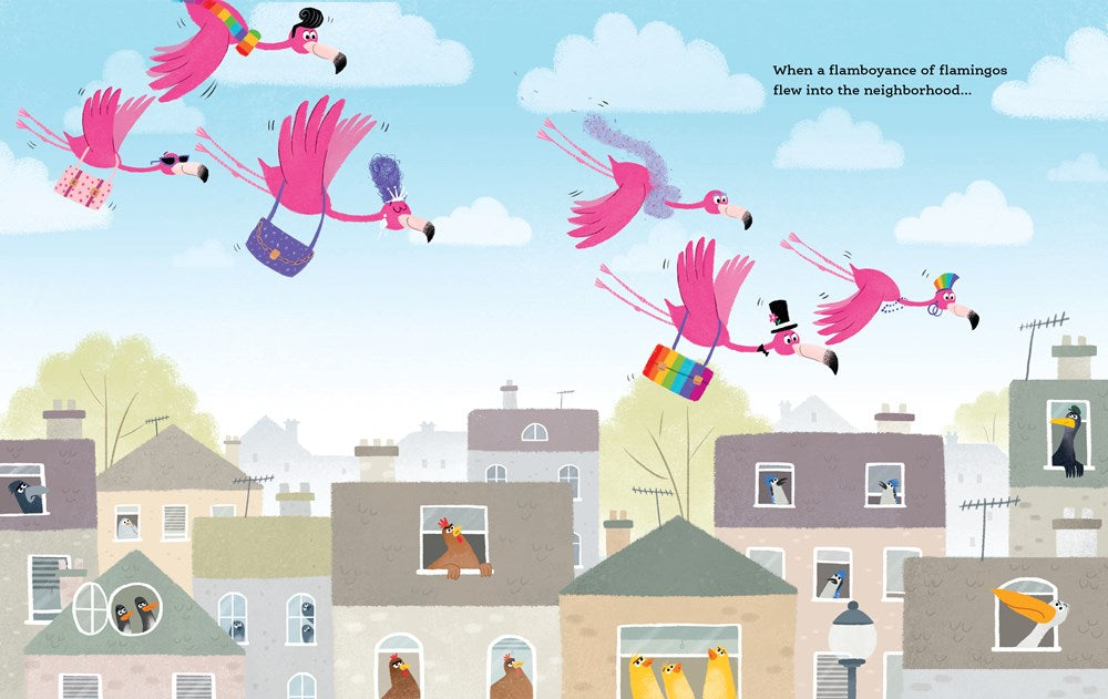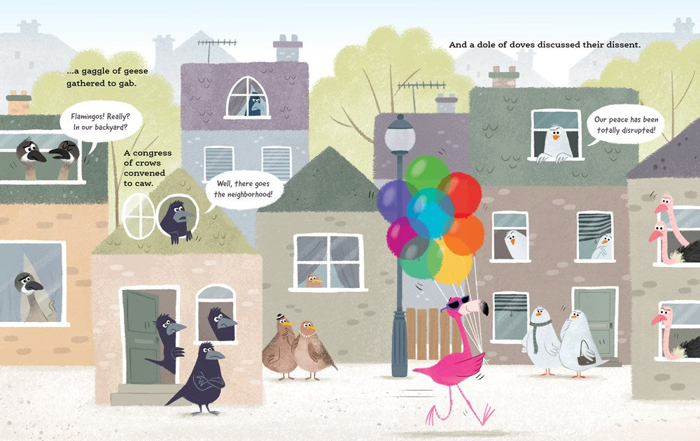 Feathered friends are flustered when flamingos move into the neighborhood… This story is a welcome springboard for age-appropriate discussions of assumptions, stereotypes, and inclusion. Engaging wordplay makes a serious point about inclusion.