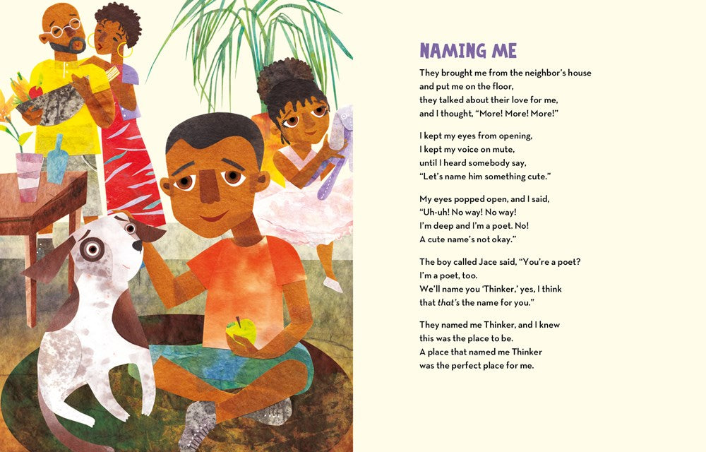In this charming book of linked poems -- the story of a pup who speaks, but only in verse -- the distinguished children's poet Greenfield glides gracefully between rhyme, free verse, haiku and rap. A boy named Jace becomes the dog's owner. He names him Thinker (I'm deep and I'm a poet, the dog warns. A cute name's not O.K.) and the two have back-and-forth chats about life. On every page, Abdollahi's collaged illustrations bring the characters to life with a soulful flair. -- The New York Times