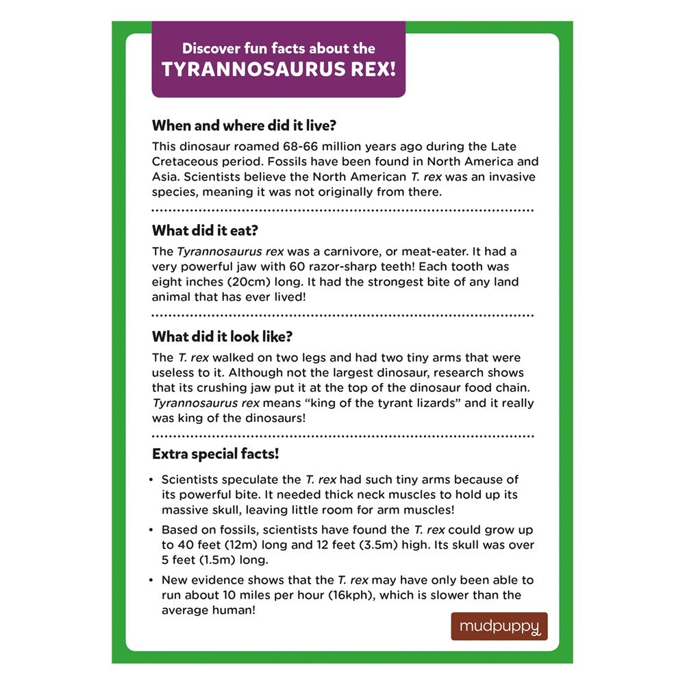 The Tyrannosaurus rex Mini Puzzle from Mudpuppy features a colorful image of a T-rex dinosaur. The 48 piece puzzle measures 8 x 5.75" so it's perfect for train or airline tray tables. A two-sided insert includes a larger image of the puzzle on one side and fun facts about the Tyrannosaurus rex on the other!