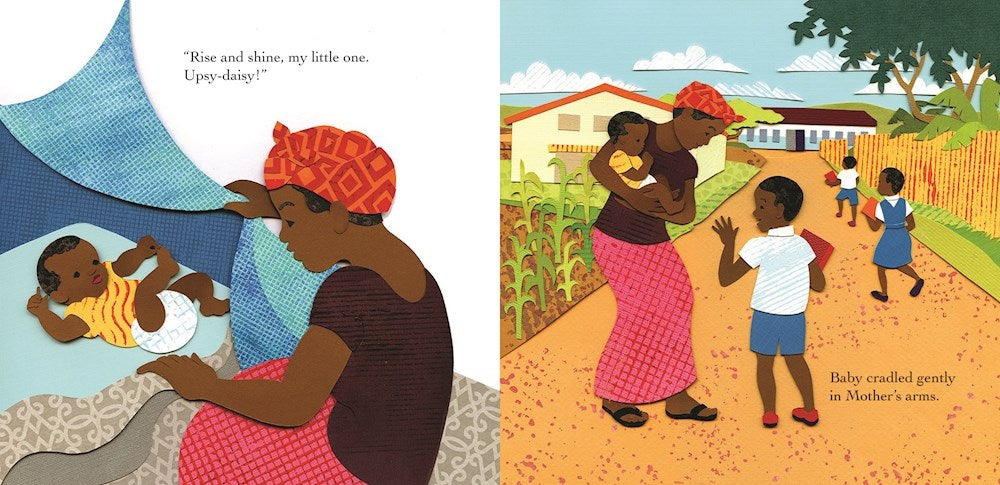 With various family configurations and settings ranging from a busy outdoor market to a high-rise apartment kitchen, the book wholeheartedly celebrates diversity. Gorgeous cut-paper collage art adds warmth and brightness, and brings the lyrical text to life. Repetition of the phrase “Upsy-daisy” on each spread lends familiarity, and reminds readers that love for a little one is a universal feeling.